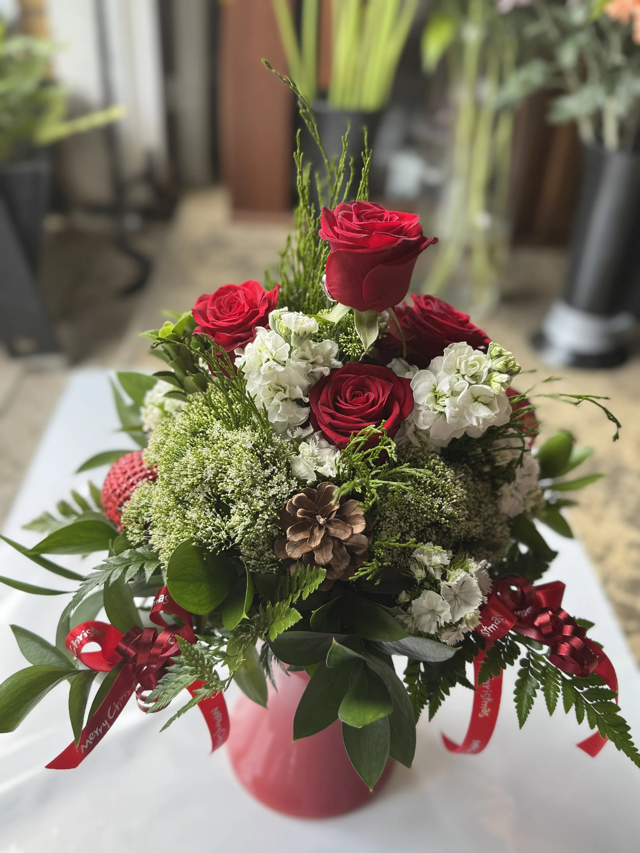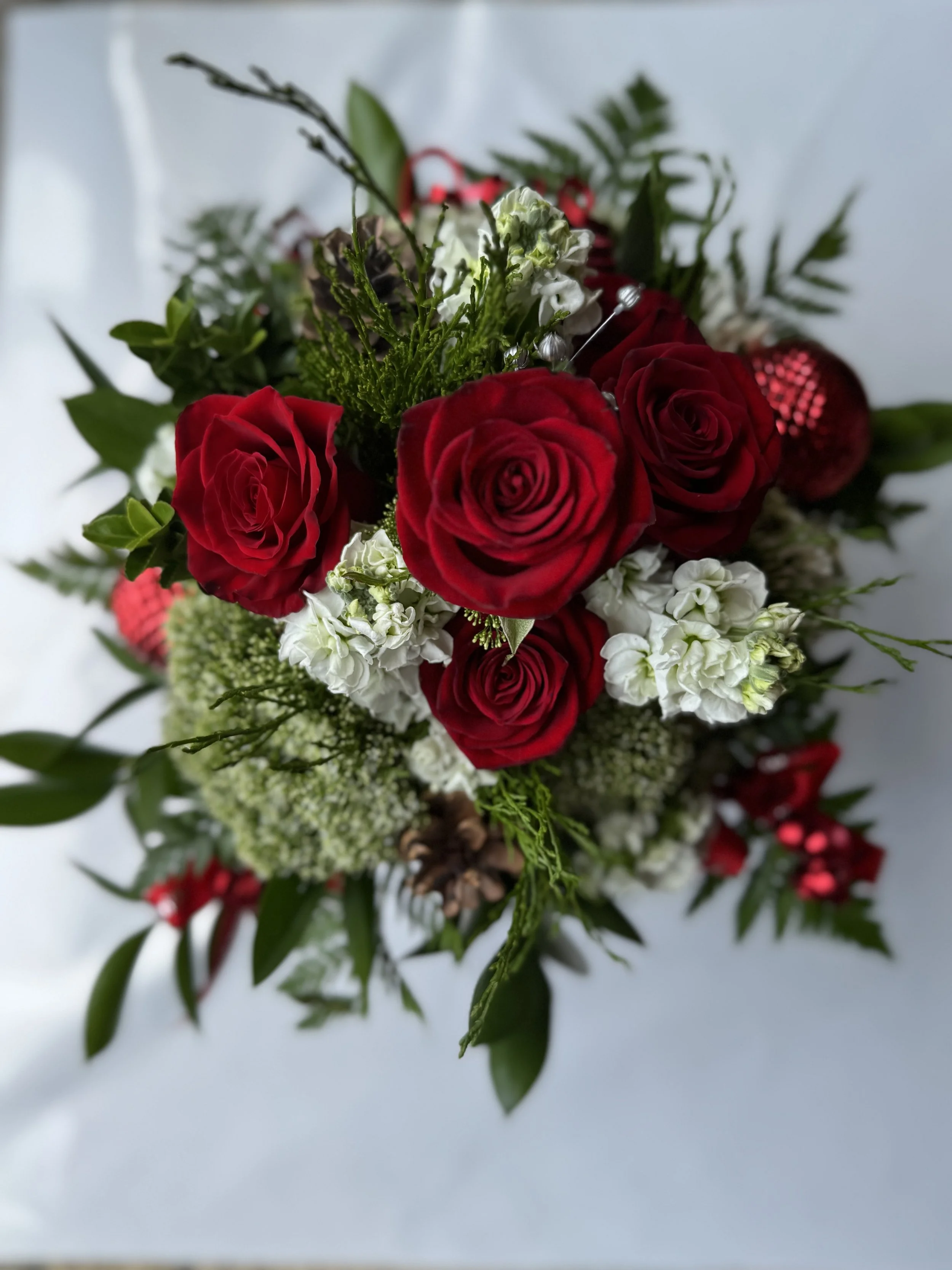 Crafted with fresh, vibrant red roses and white blooms for a festive look.